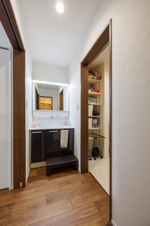 水回り近くに配置したWIC(ウォークインクローゼット)でスムーズな家事ラク動線と、オープン洗面台で忙しい朝も快適な住まい!2日間限定の完成見学会開催!