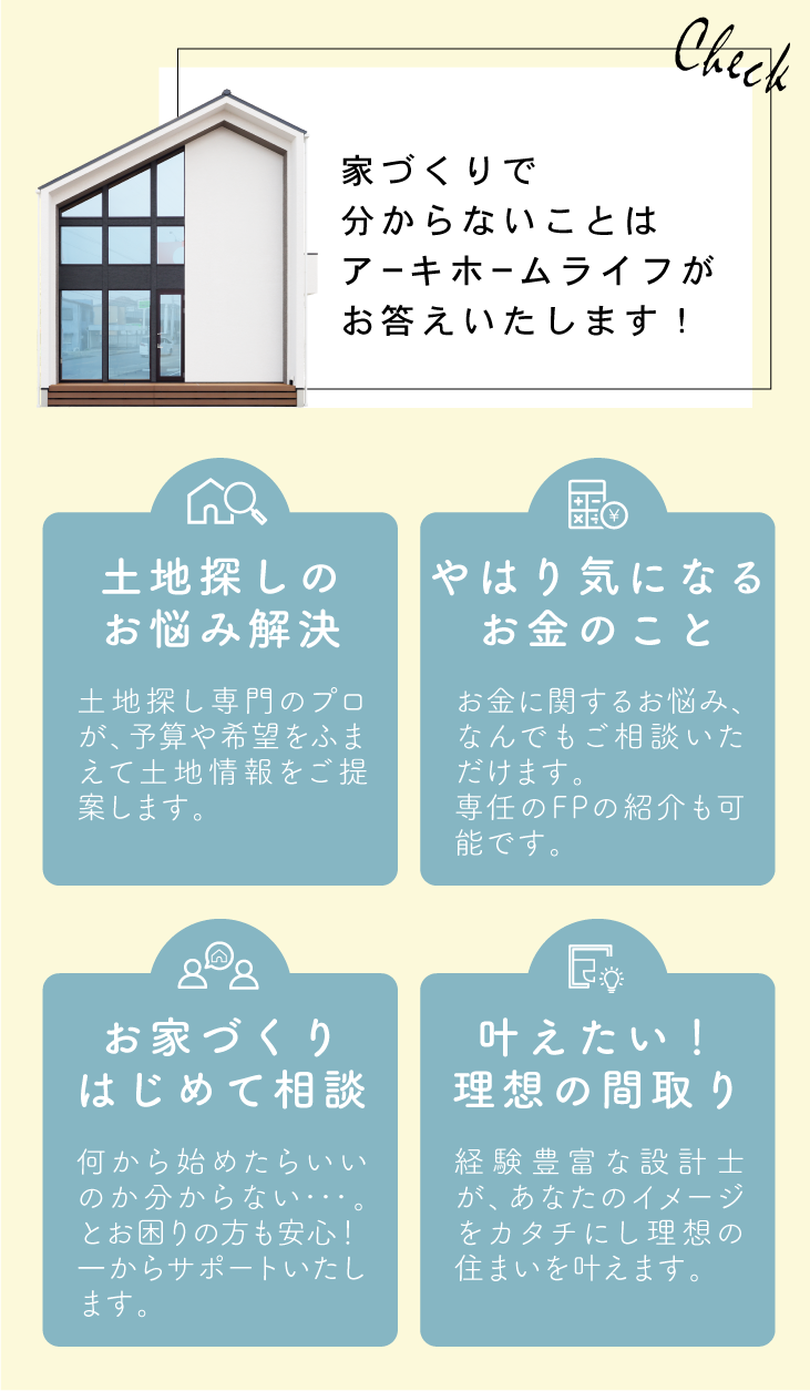 ●家づくりのご相談と合わせて設計相談や資金相談、土地探し相談もOK!