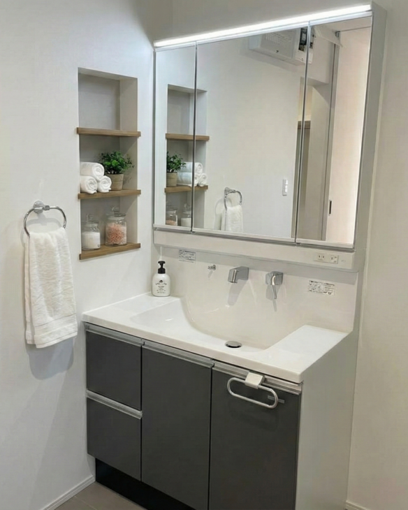洗面台の横に設けたニッチ収納は、歯ブラシやコップ、化粧品など、毎日使うものをスッと取り出せる便利スペース!