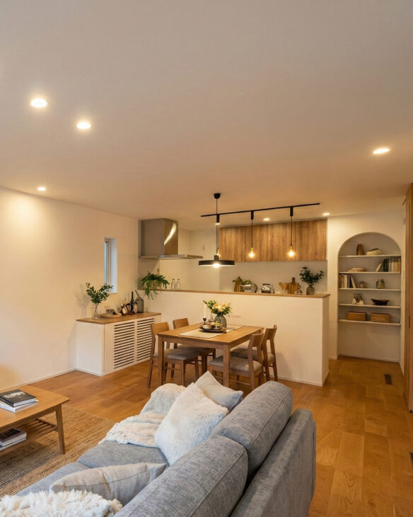 アーチ壁が可愛いパントリー!扉のないオープン収納は、おしゃれな「見せる収納」として空間を彩り、出し入れもスムーズで家事が快適に。