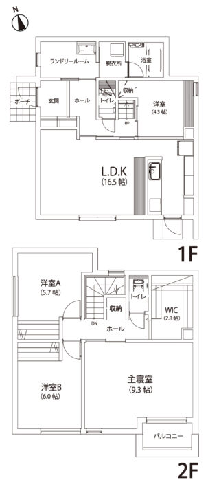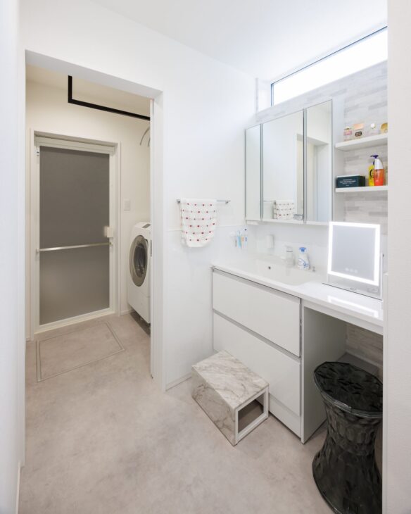 ランドリールーム、脱衣所、浴室までが一直線につながっているため、「洗う・干す・しまう」が最短距離で完結。
