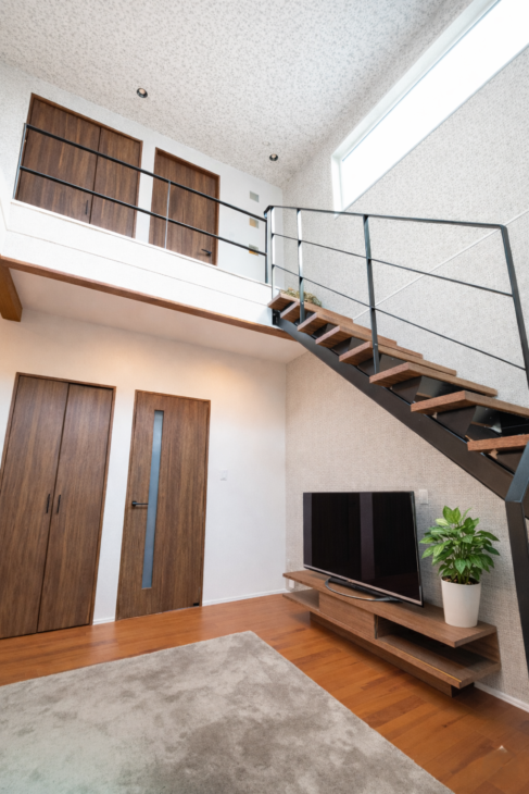吹抜とアイアン階段が縦の広がりを演出する、開放感とデザイン性を兼ね備えたリビングです。