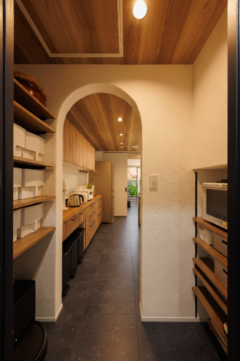 キッチンに隣接した配置で、生活感を見せずにたっぷり収納できる、使い勝手と動線効率を両立した食品庫です。