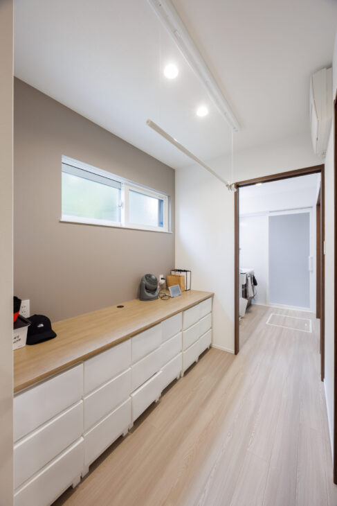 ウォークインクローゼット(WIC)と脱衣所が繋がっている間取り。「脱ぐ→洗う→干す→しまう」という洗濯の一連の流れが、すぐ隣のスペースで完結します。