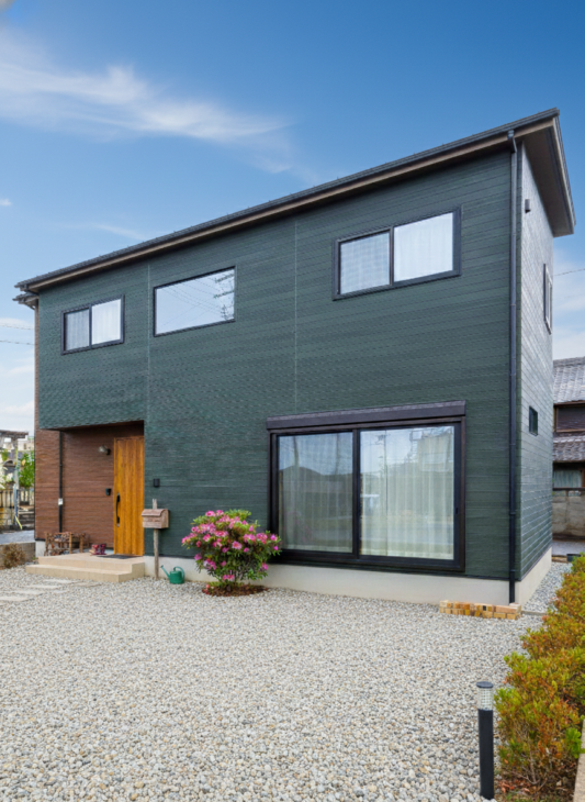 深みあるダークグリーンの外観と、暮らし広がる畳コーナー×書斎を備えた家