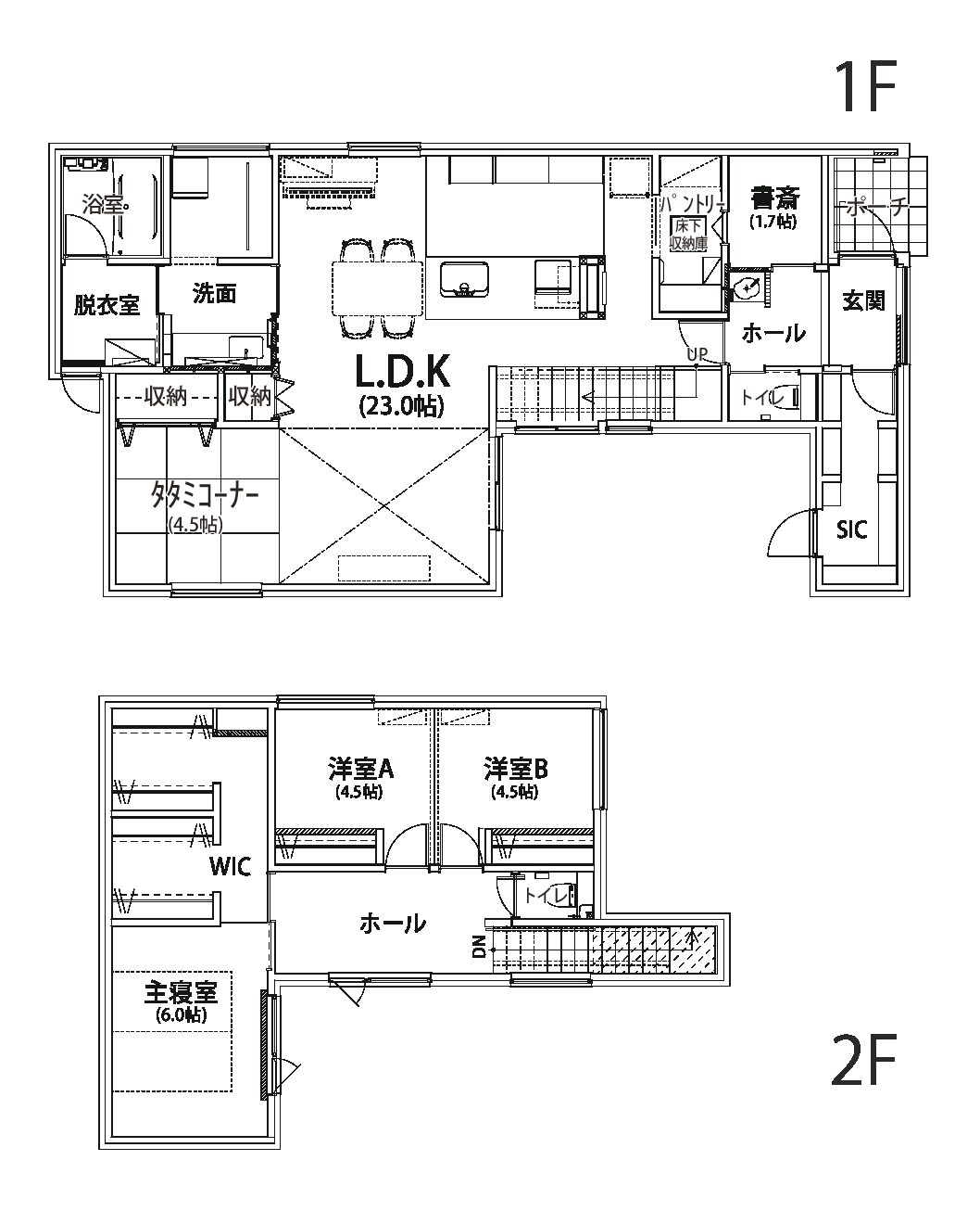 23帖LDKを中心に、畳コーナーや書斎を備えた家族想いの間取りをぜひご覧ください!