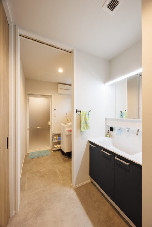 脱衣室と洗面室を分けたセパレート設計で、家族が気兼ねなく使える快適な動線を実現。
