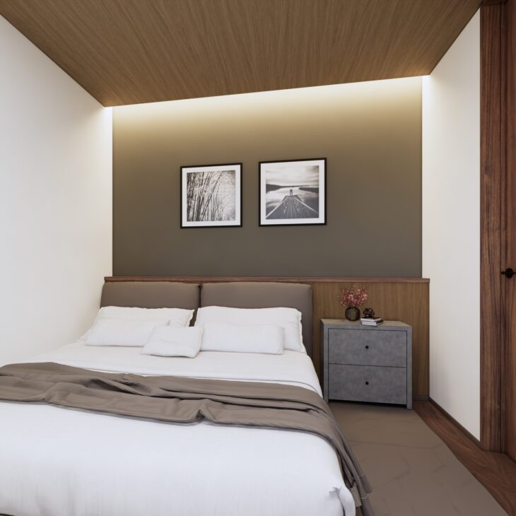 木目天井と間接照明がつくる、やさしい光の寝室。一日の疲れを包み込む、上質なリラックス空間です。