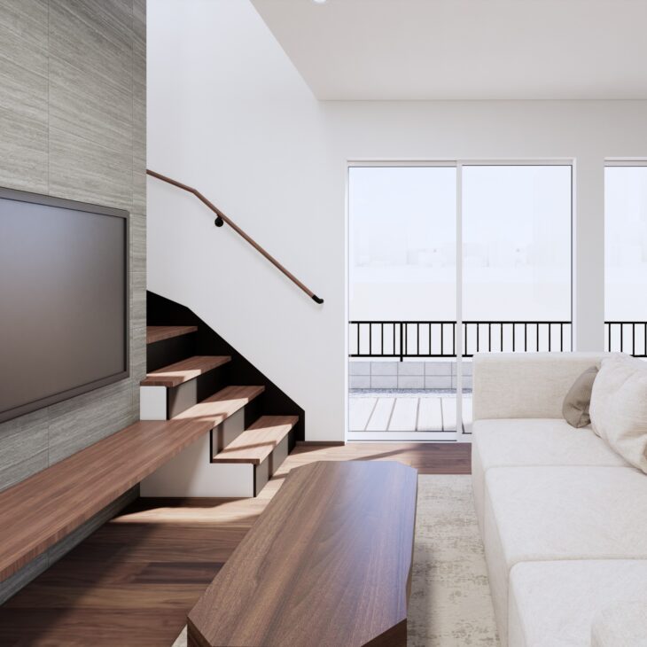 テレビボードから階段へとつながる、統一感ある造作デザイン。石目調のアクセントクロスが上質な空間に。