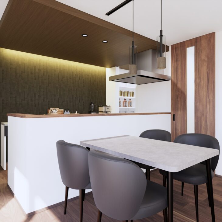 シンプルな中に上質さをプラス。カフェやホテルのように落ち着いて過ごせるダイニングキッチン。