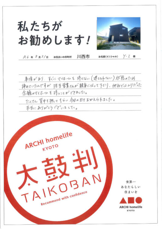 事情があり、すぐにマイホームを持てない(建てられない)状態のため、諦めていたんですが、担当営業さんが親身になってくださり、他社では無理だった念願のマイホームを持つことができました。