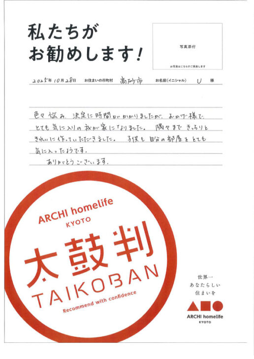いろいろ悩み、決定に時間がかかりましたが、おかげ様でとても気に入りの我が家になりました。