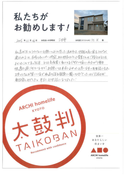 私たちがアーキホームライフさんにお願いしようと思った決め手は、性能の高い家をコスパよく建てられること、当時のキャンペーン内容、あと担当くださった営業さんのご対応がとてもよかったことです。