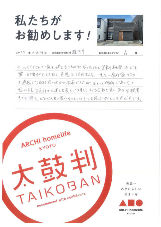 一生に一度の家づくりを直感で決めていいのかと不安でしたが、正しい判断であったと思います。
