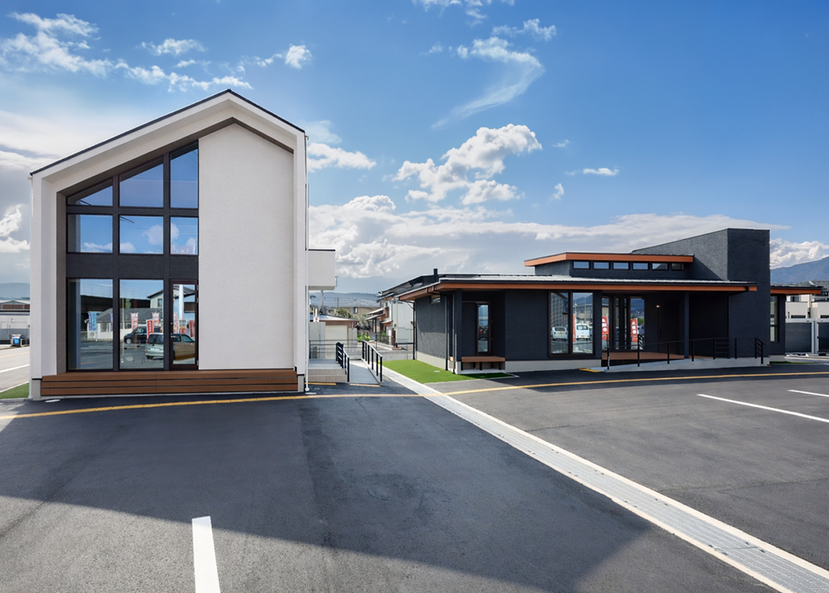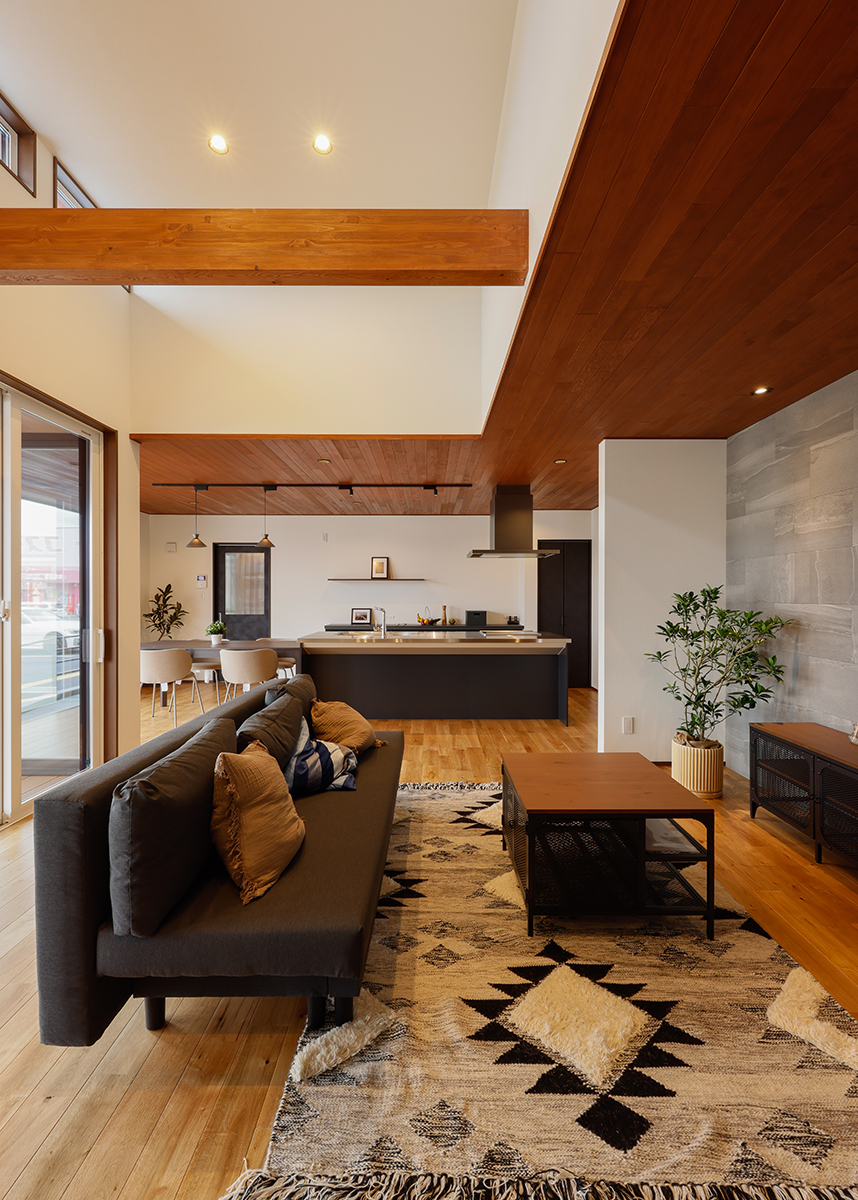 ●ブラック×木目のスタイリッシュな外観の平屋は、無垢床と一部漆喰塗で仕上げた自然素材モデル。