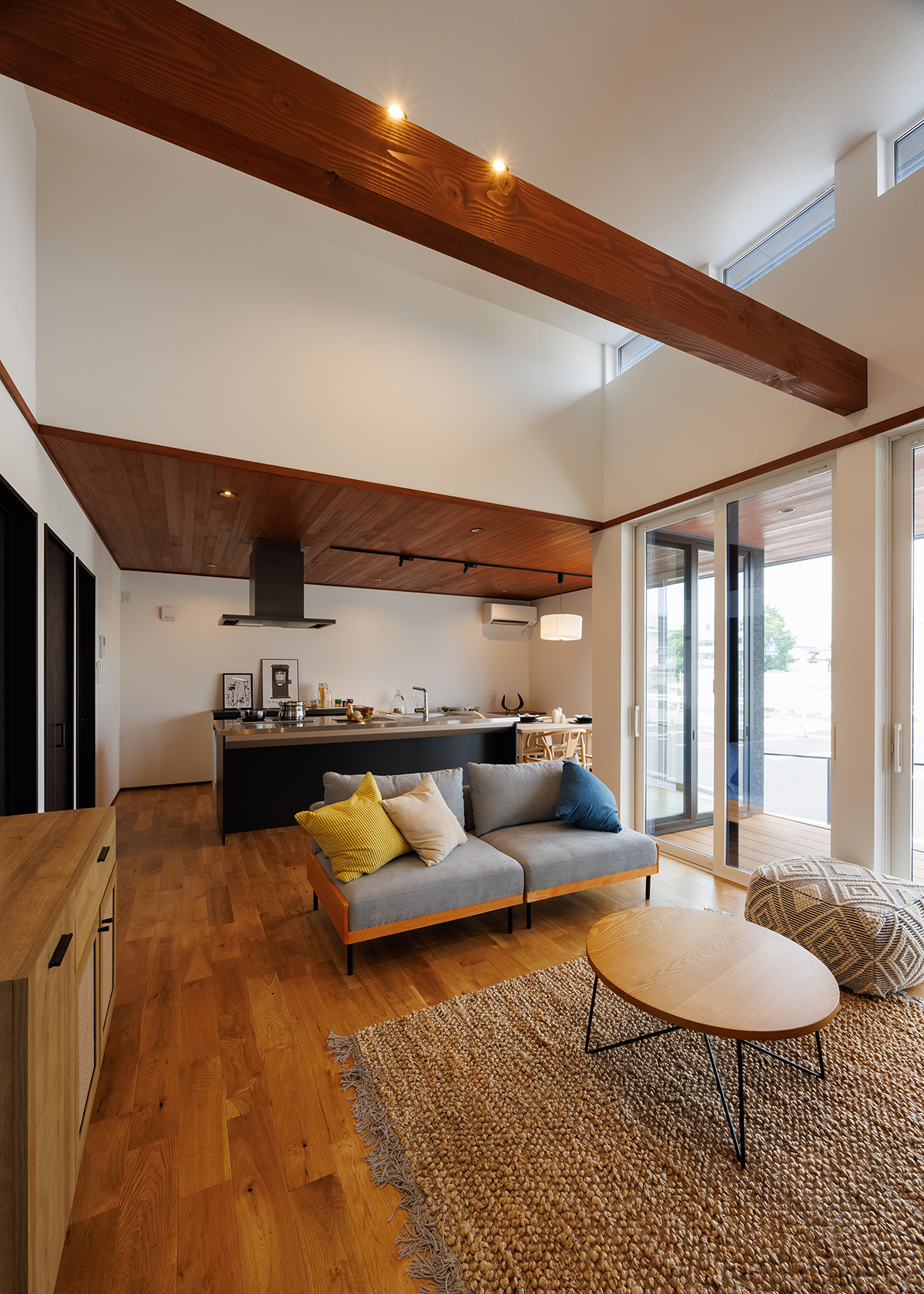 ステンレスのフルフラットキッチンから吹き抜けへと繋がる大空間。