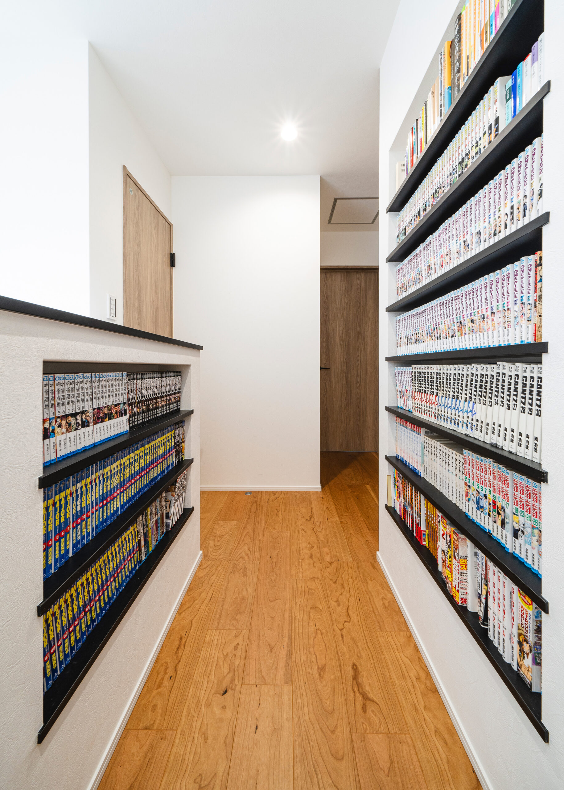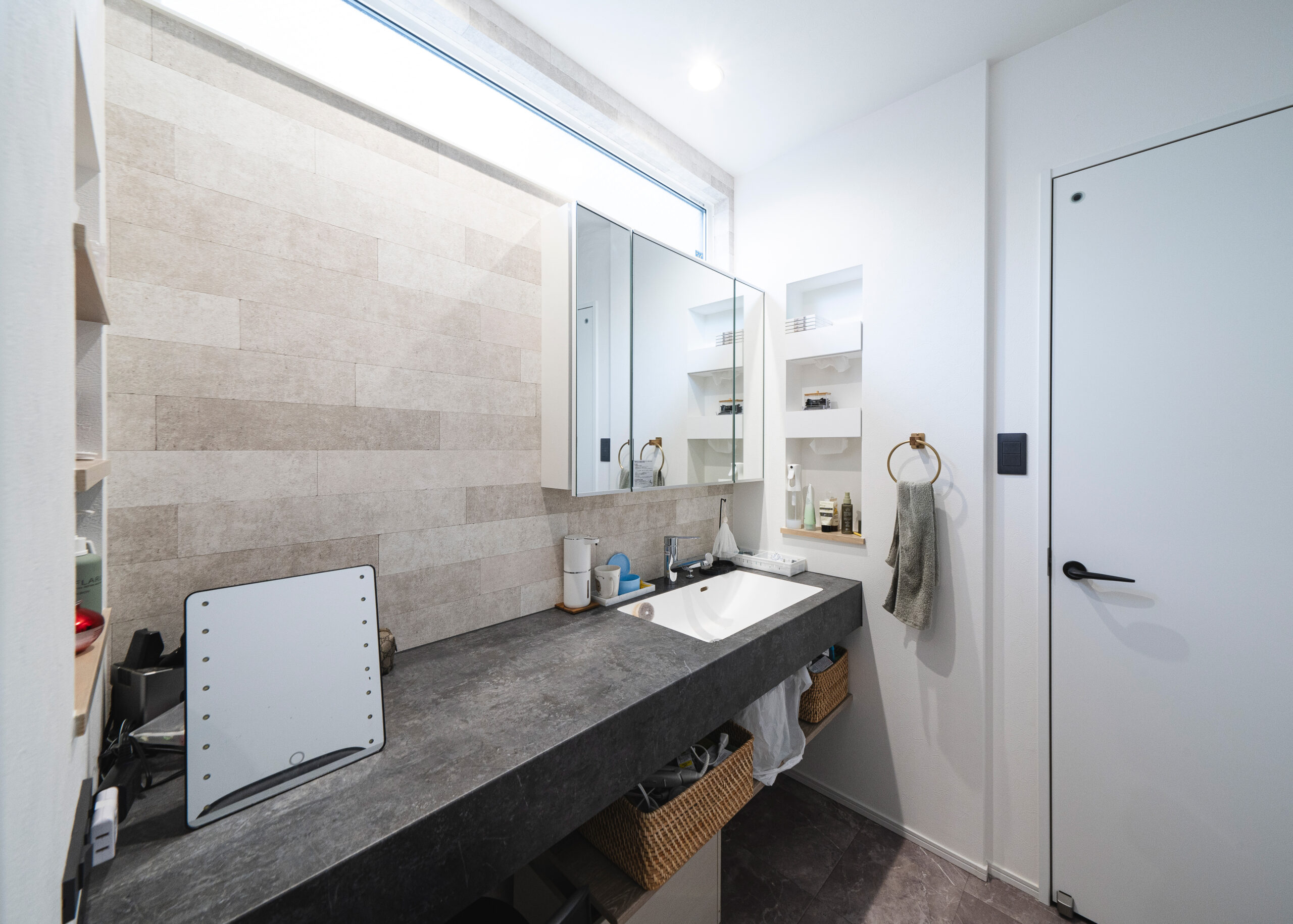 旦那様:僕は実家の父親と母親が新しい家建てた時に母親が冗談で父に文句言ってる姿を見てたんので、女性の心掴まなあかんと思ってたんで、まずはその洗面所、女性の方って毎日化粧されると思うんですけど、狭い所じゃなくて広い空間の中で化粧してもらった方が妻の気持ちも明るくなってそれが回り回って家族を明るくすると思ってたんで、ちょっと綺麗事に思いますけど本当にそこを重点的に、彼女がしたいことをっていうことを全てにおいてこだわったと思います。特にニッチが多くて、営業も方もこの家ニッチ多いねって言っていただいて、ニッチをたくさん置くことによってオシャレになったかなって思います。