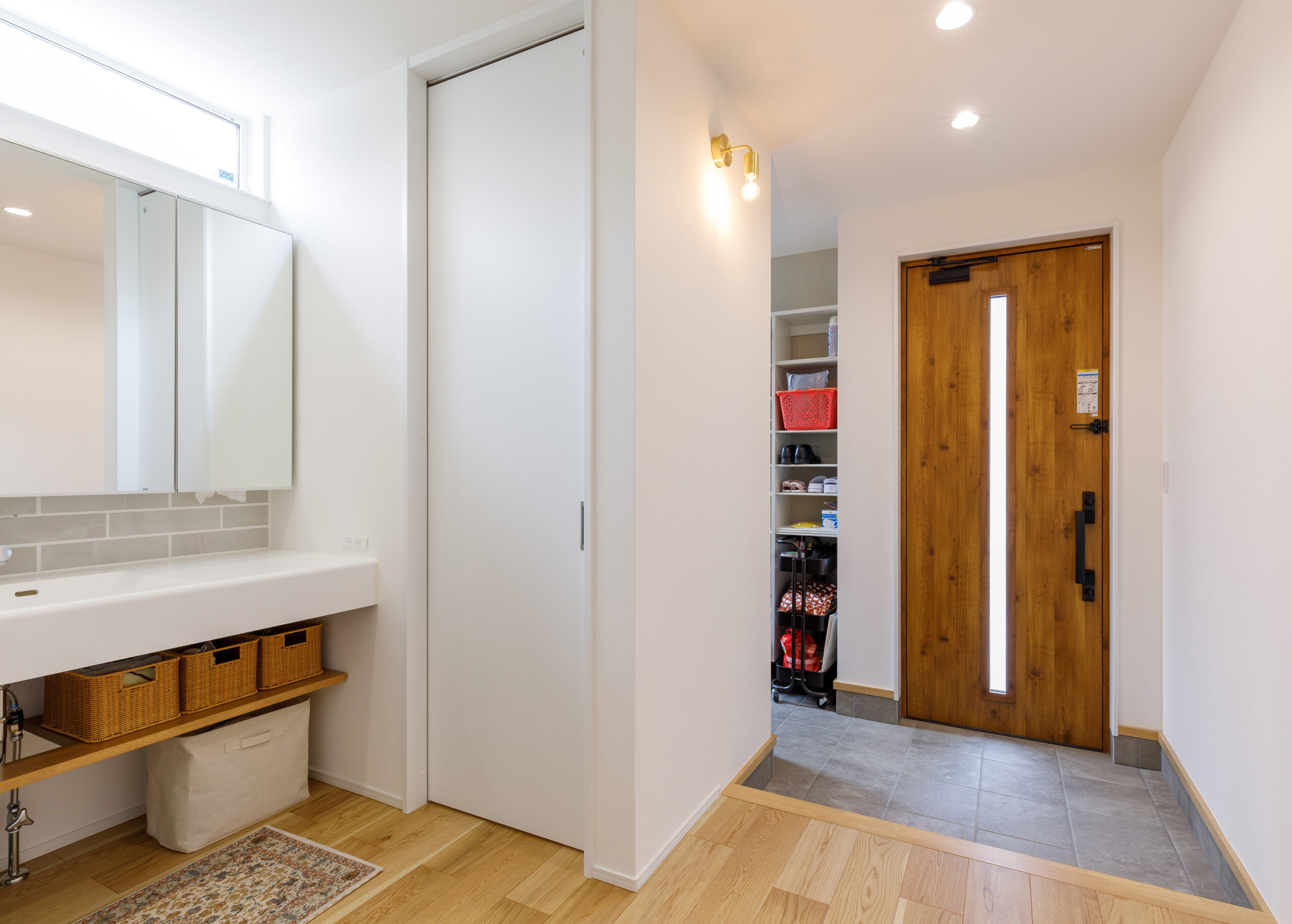 奥様:それもありますし、まず脱衣所を広く取りたくて、脱衣所兼クローゼットみたいなお洋服もちょっとしまえるようにしたくて、ちょっと脱衣所を広く取りたかったっていうのもあるんですけど、洗面を別にしている方が将来的に子供がお風呂に入っている時でも別々に使えたりとか、そういう使い方がしたくて分けました。