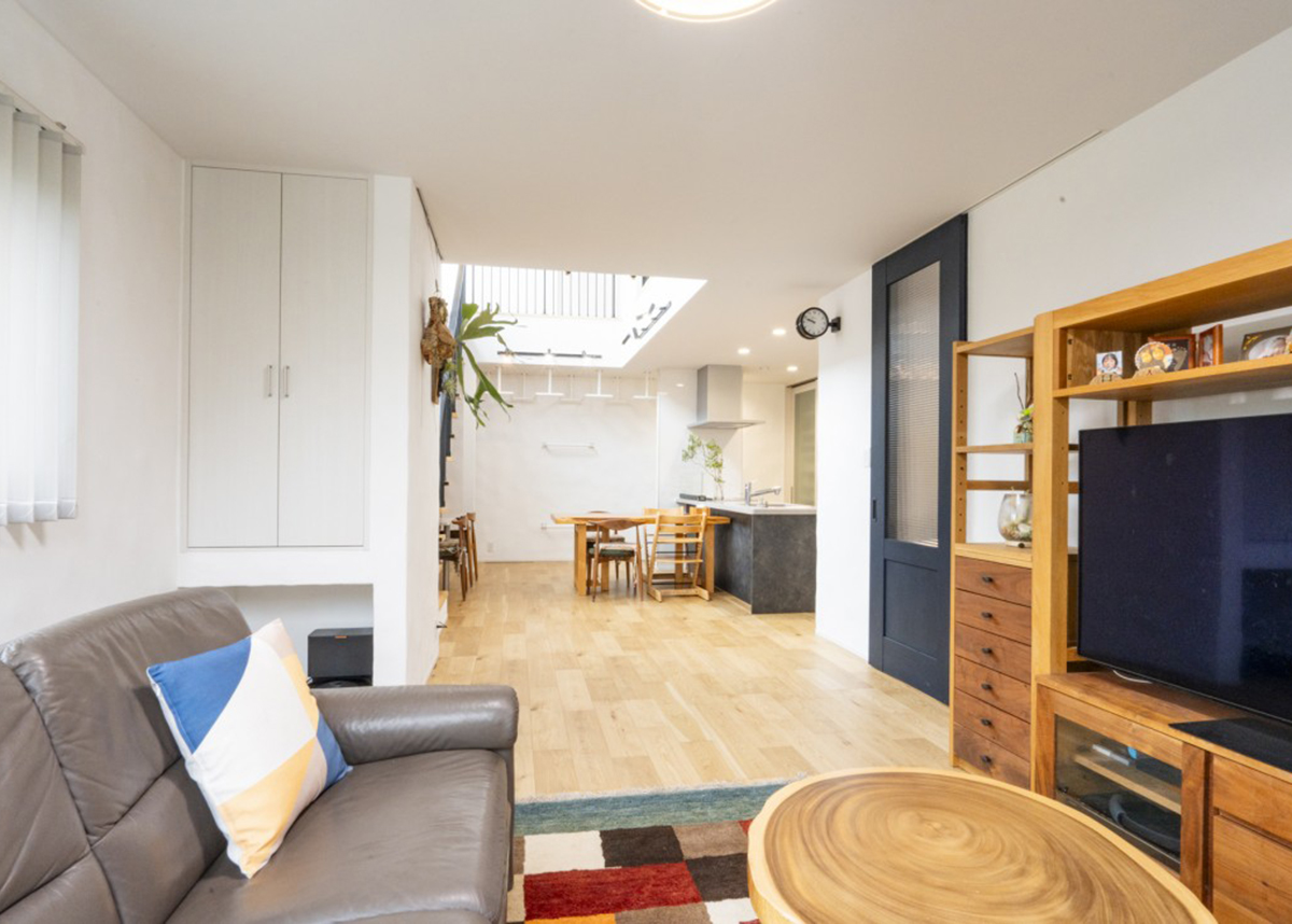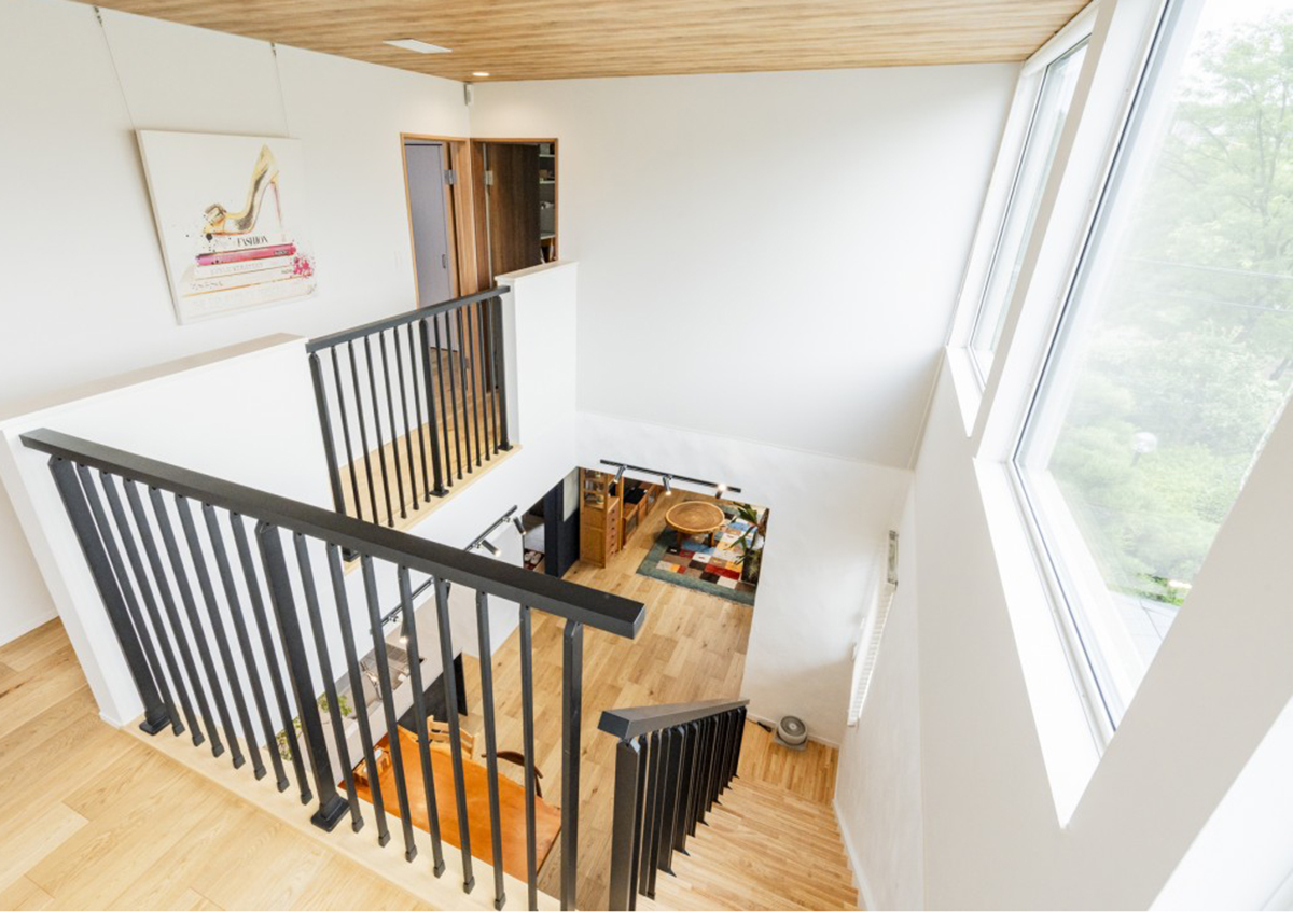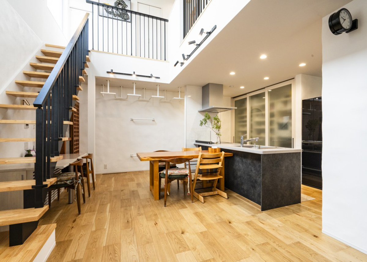 吹き抜け+スケルトン階段で開放感あふれる空間を演出しています。