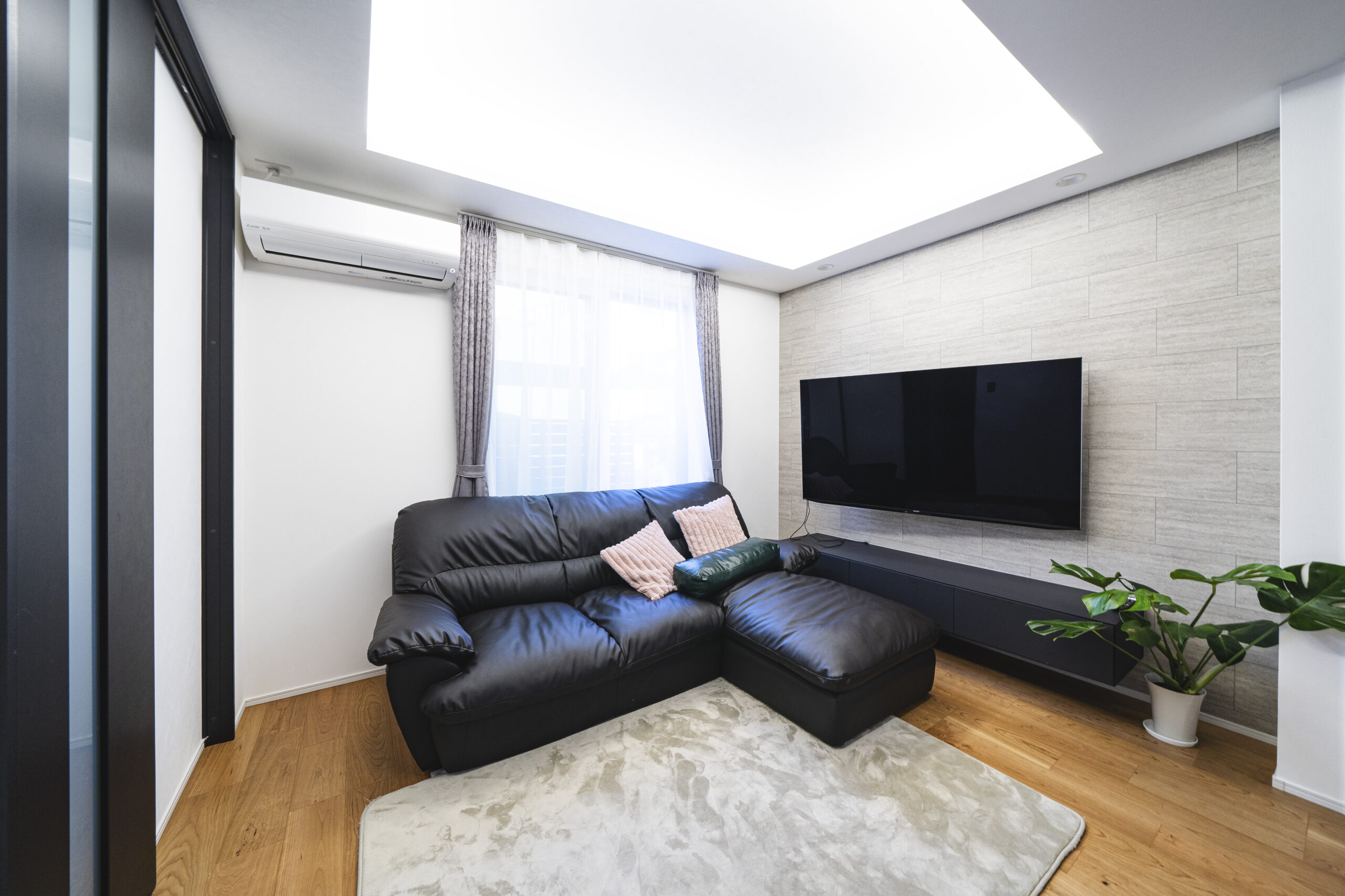 ブラックと木目のアクセントがお洒落なお家。内装はシックで大人かっこいい雰囲気と木目のナチュラルな雰囲気が融合した空間に仕上がっています。