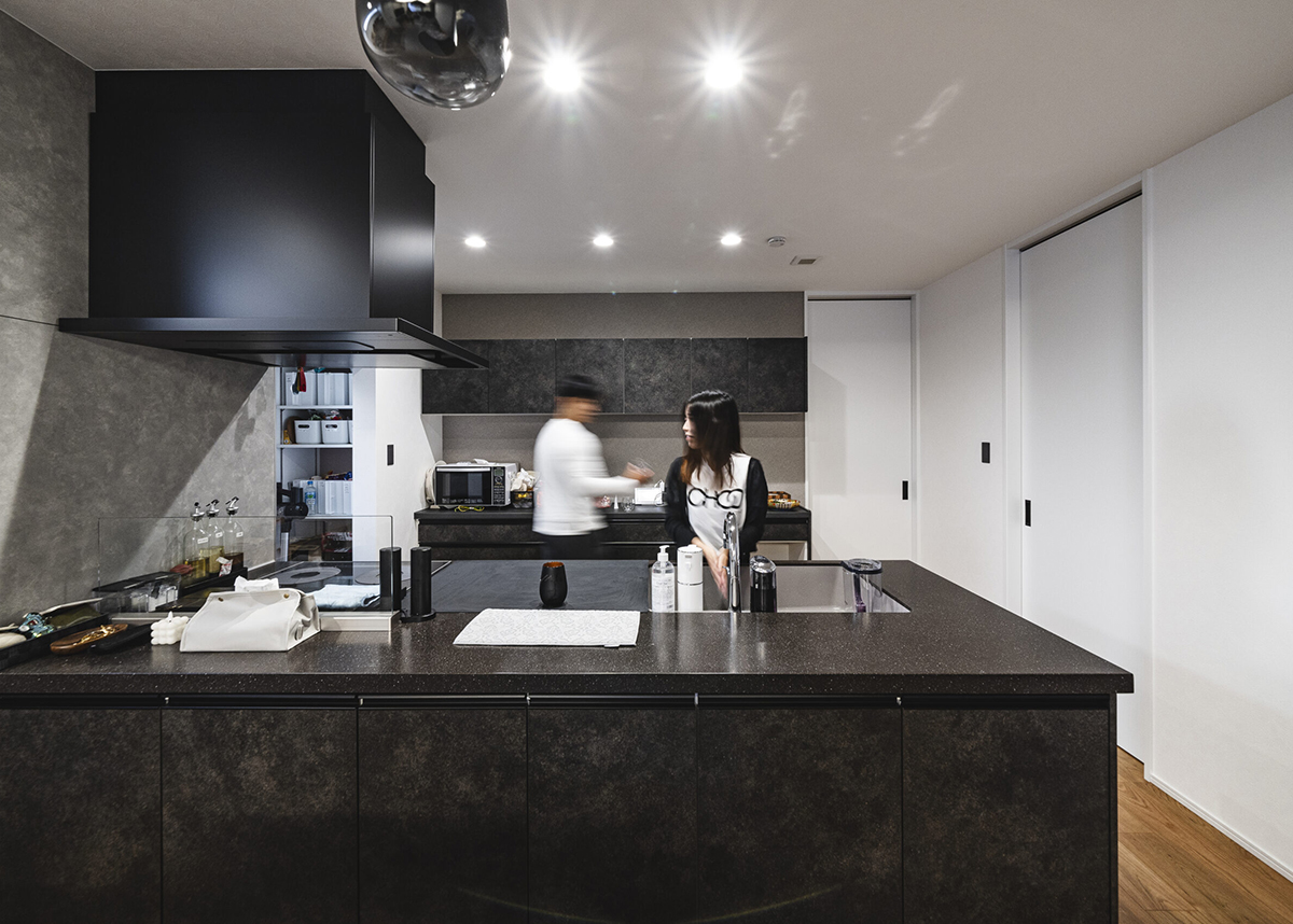 フルフラットの手入れしやすいキッチンは、カップボードと合わせたチャコール×黒の天然石模様で高級感のある空間に。パントリーやカップボードもあり収納力十分ですが更にキッチン前面にも収納を設け収納に困ることのないストレスフリーな空間に。
