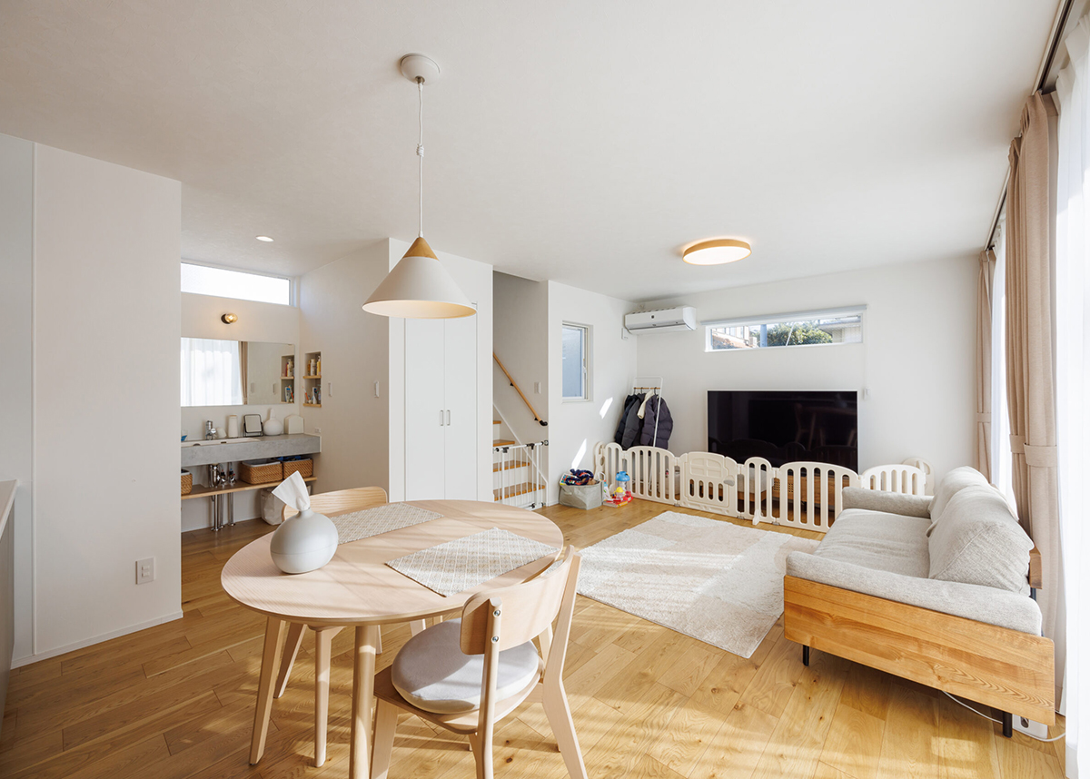 帖数以上に開放感のあるLDK!ホワイトに木目調が映えるモダンハウス
