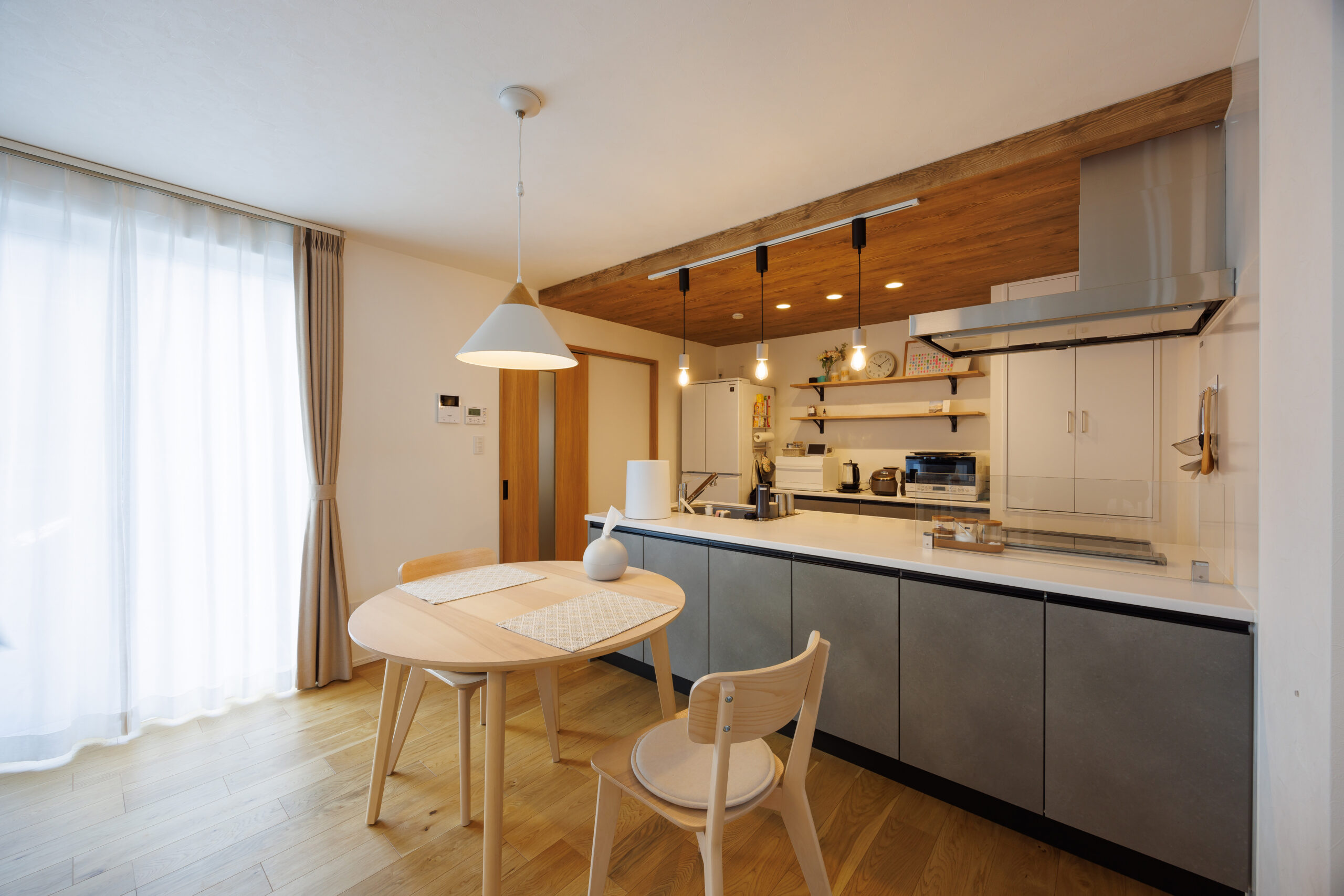 キッチン上部には木目の折り下げ天井をアクセントとして採用しました。キッチンをフルフラット型にすることでダイニングと繋がりが生まれ、帖数以上に広く感じられます。