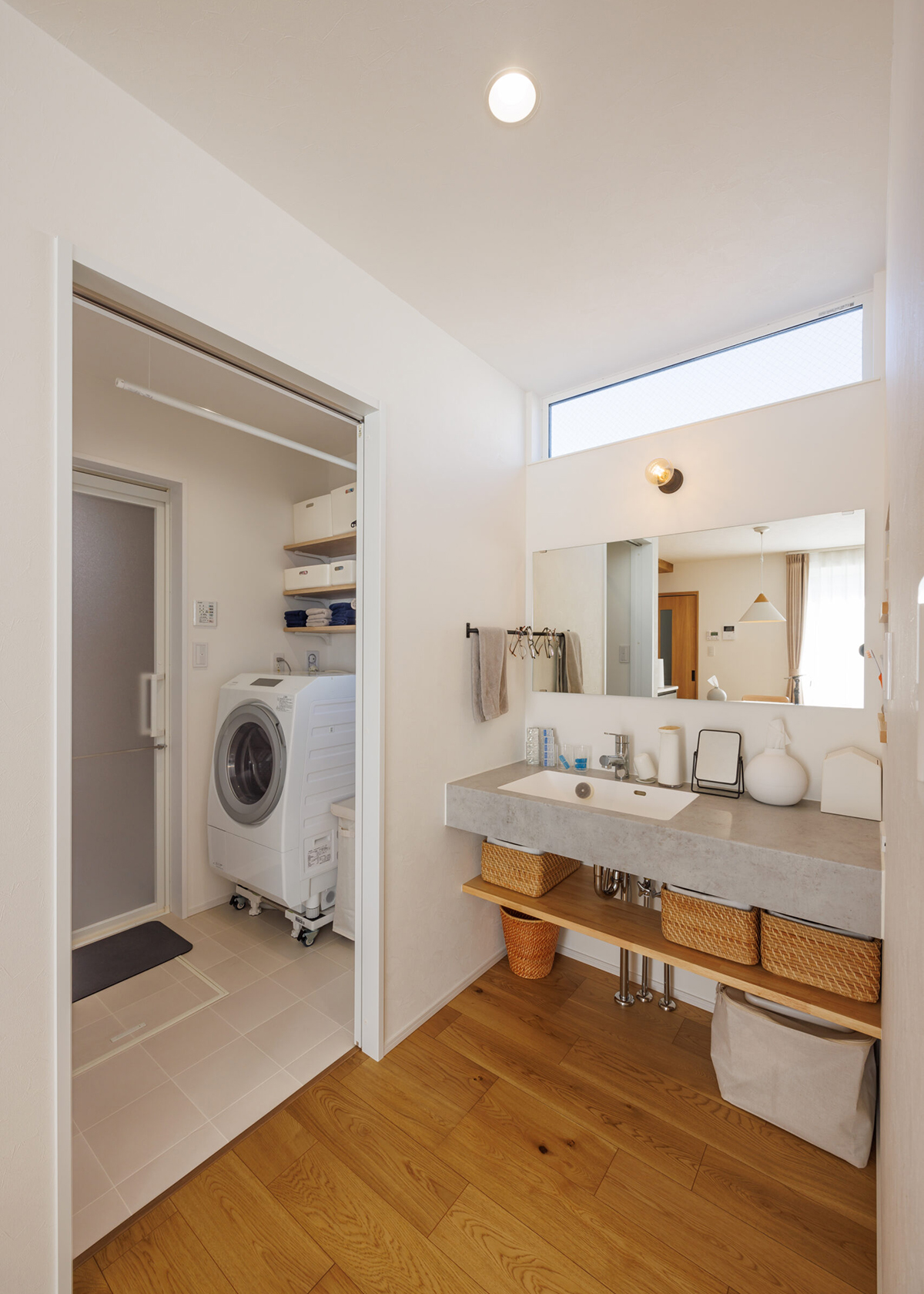 リビングを広く見せたい!脱衣室と空間を分けたい!というご要望から、間仕切りのないオープンな空間に洗面台を設けました。キッチンと色味を合わせて統一感もあります。
