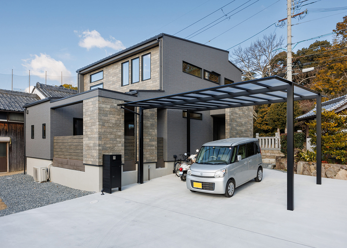 濃いグレーのボーダータイルの外壁にアクセント部分には岩の大判サイズのグレーを採用し、同じグレーでも模様と質感の違うグラデーションがつく配色に仕上げました。