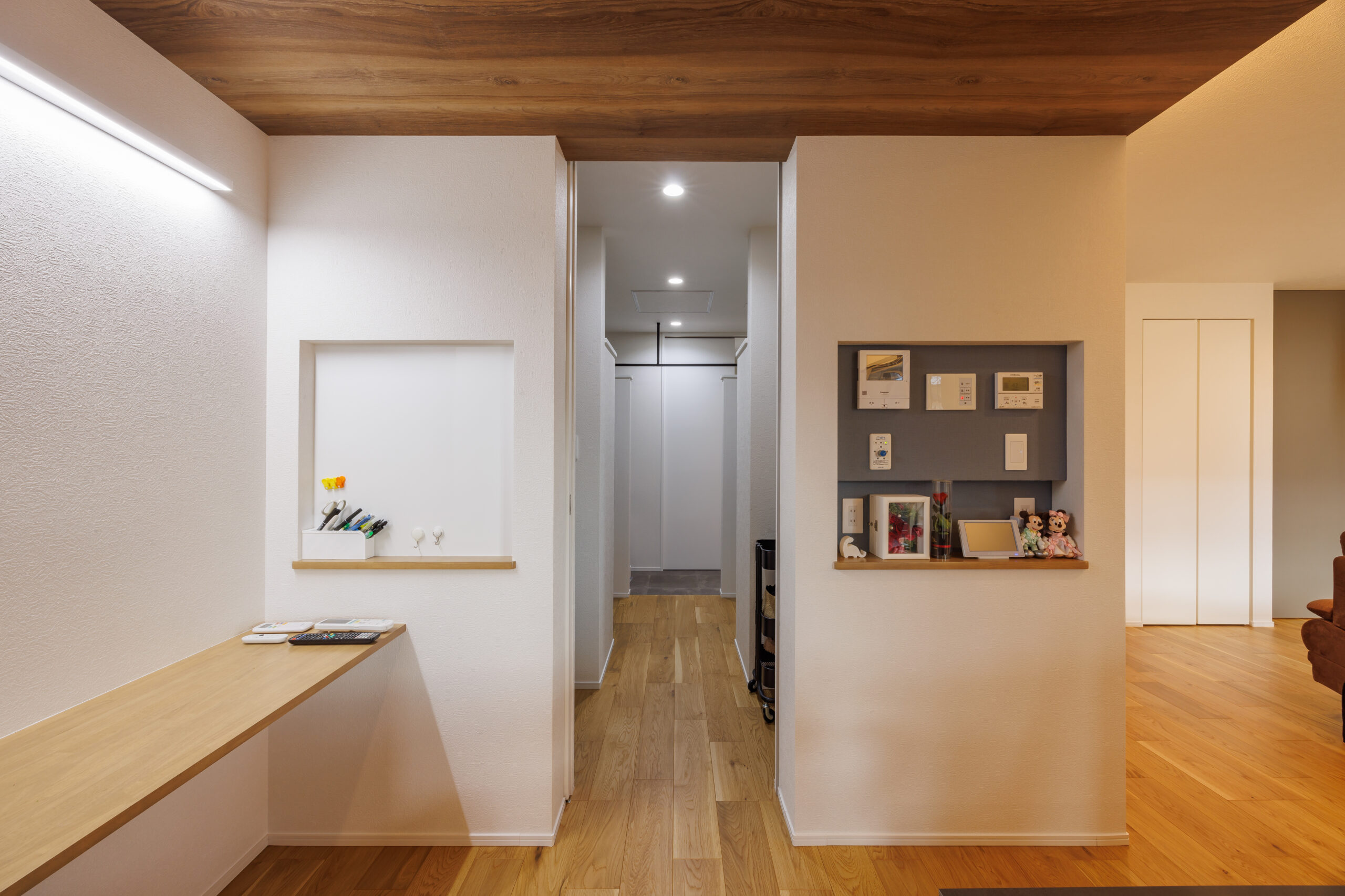 お施主様こだわりのニッチ横は多目的室と呼ばれる空間と繋がっており、パントリーや書斎、L字型のファミリークローク、洗濯室、脱衣室が続く動線となっています。