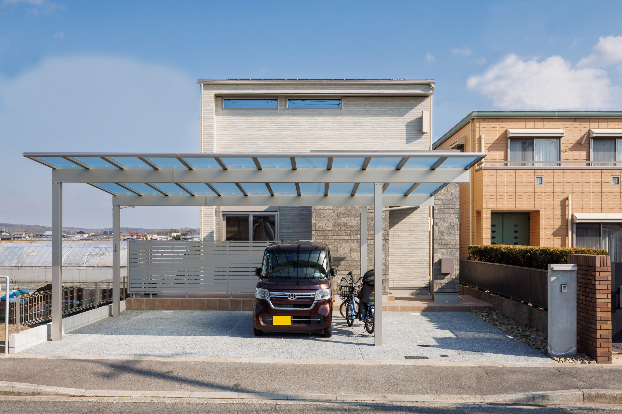 正面から玄関を見せない手法にこだわり、アプローチの先にレンガ調の壁を付けました。最大3台駐車可能なゆとりのあるエクステリアです。