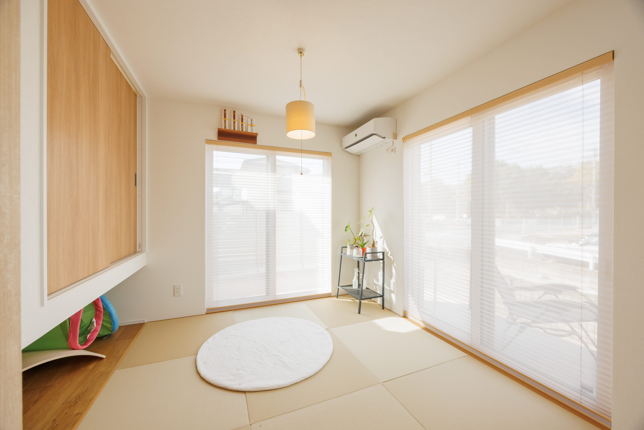 浮かせた吊り押し入れを採用することで、下部に板の間ができお子様のおもちゃ道具も収納することができます。L字型の空間は将来的に仏間として活用予定です。