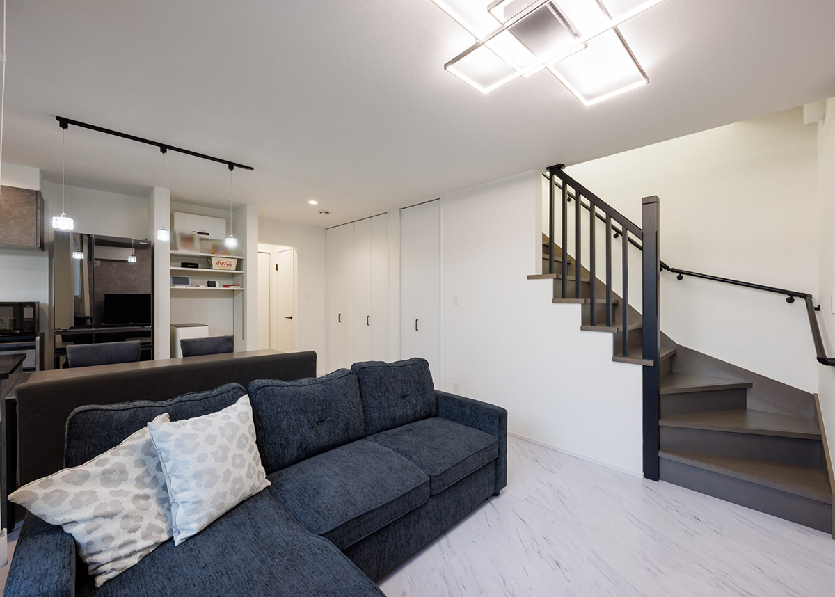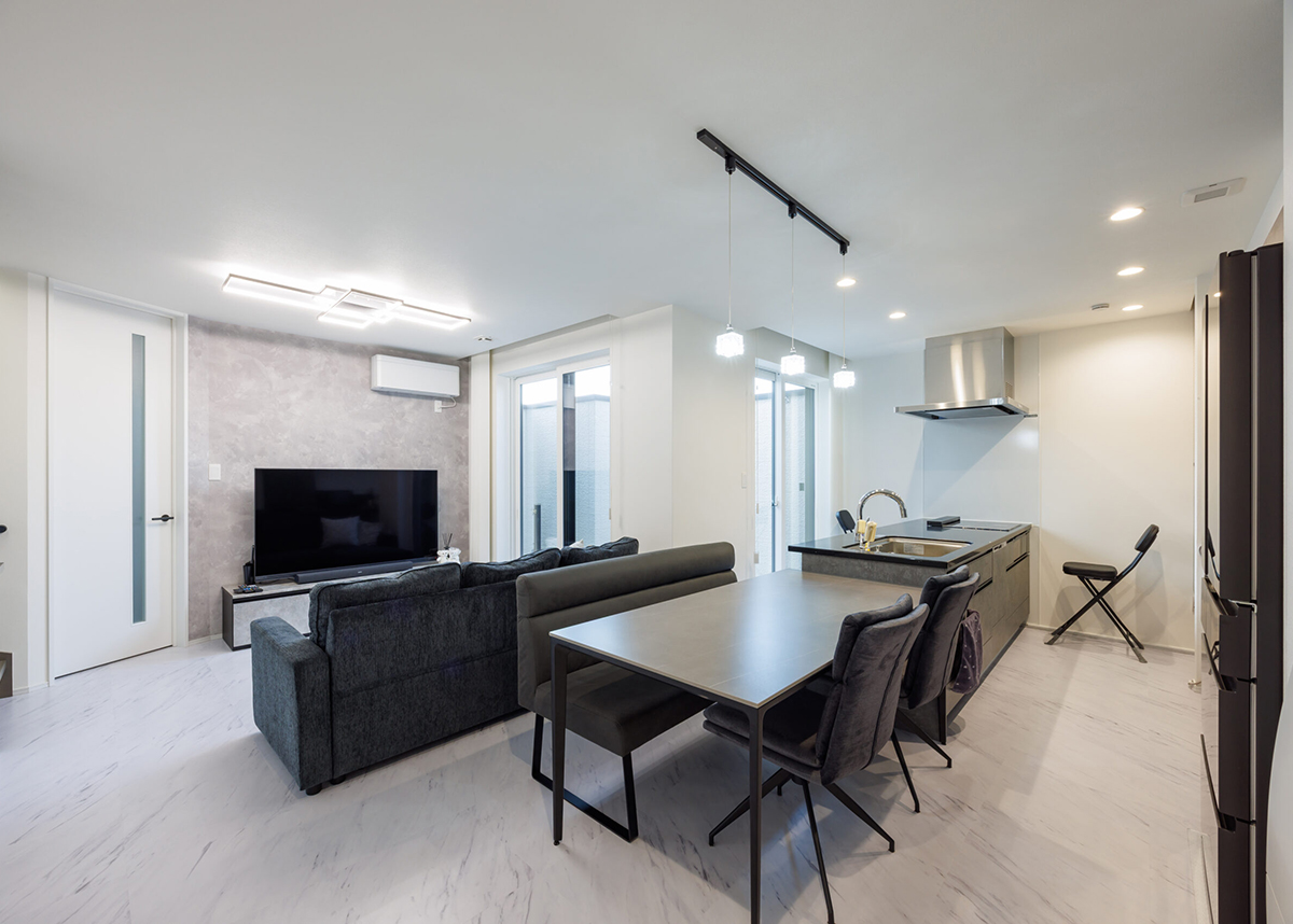 17.4帖のLDKはホテルライクのテーマに合わせて、床には大理石調のフロアタイルを貼り、家具や家電をブラックとグレーでまとめました。