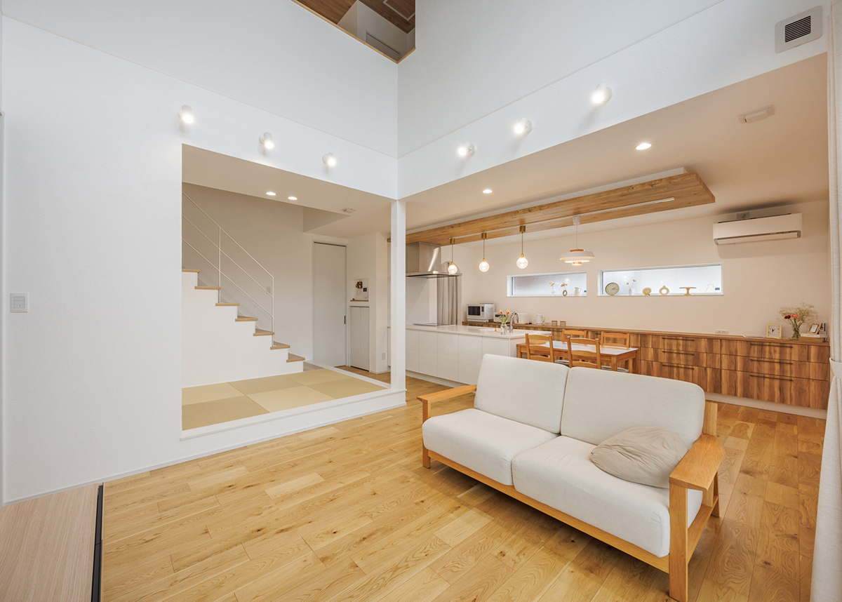 リビング部分が吹き抜けになった開放感抜群のLDK。階段の隣に小上がりのタタミコーナーがある個性的な間取り!気軽に腰掛けたり寝転がったりできる家族のくつろぎ空間。
