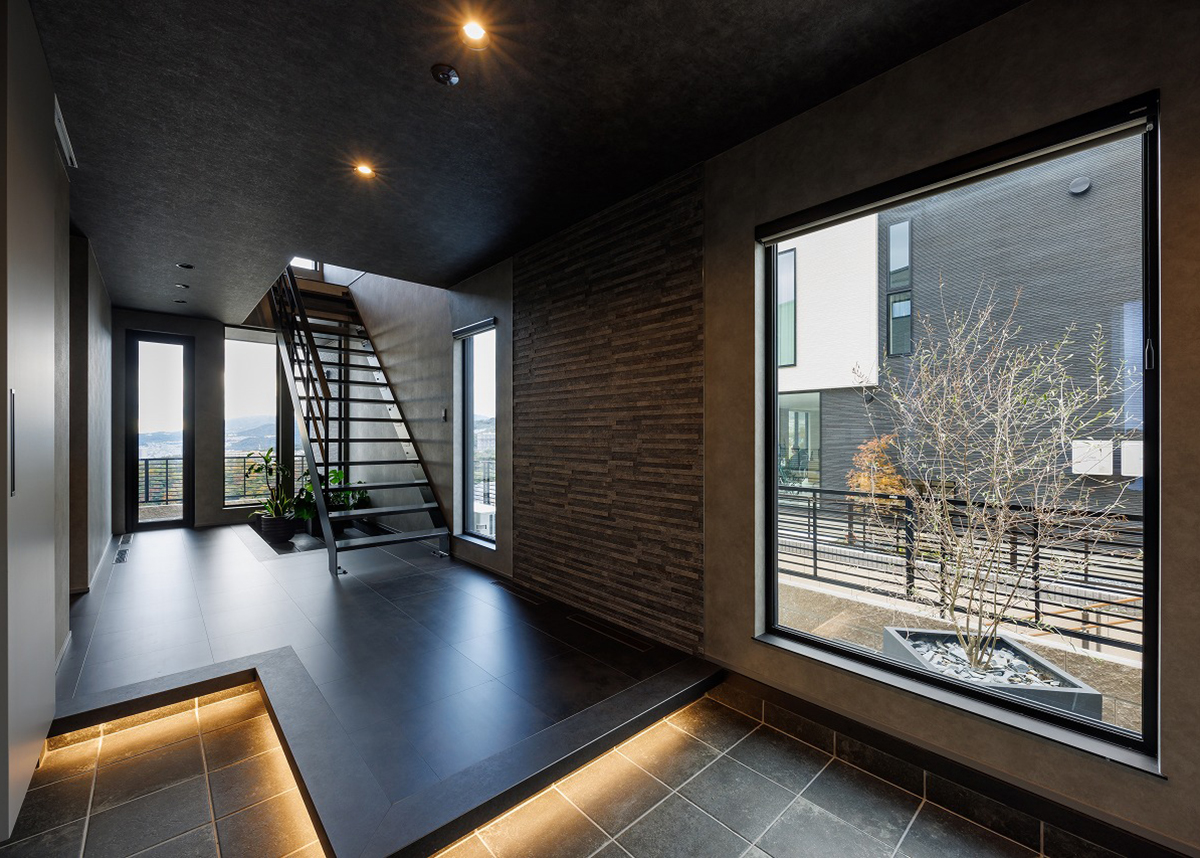 大きな窓とスケルトンの階段で奥行きと開放感のある玄関には、タイルの壁と階段下の小さな土間空間、間接照明をアクセントに間延びしない上質な空間に仕上がっています。お庭や高台ならではの壮大な景色が望める玄関になっています。