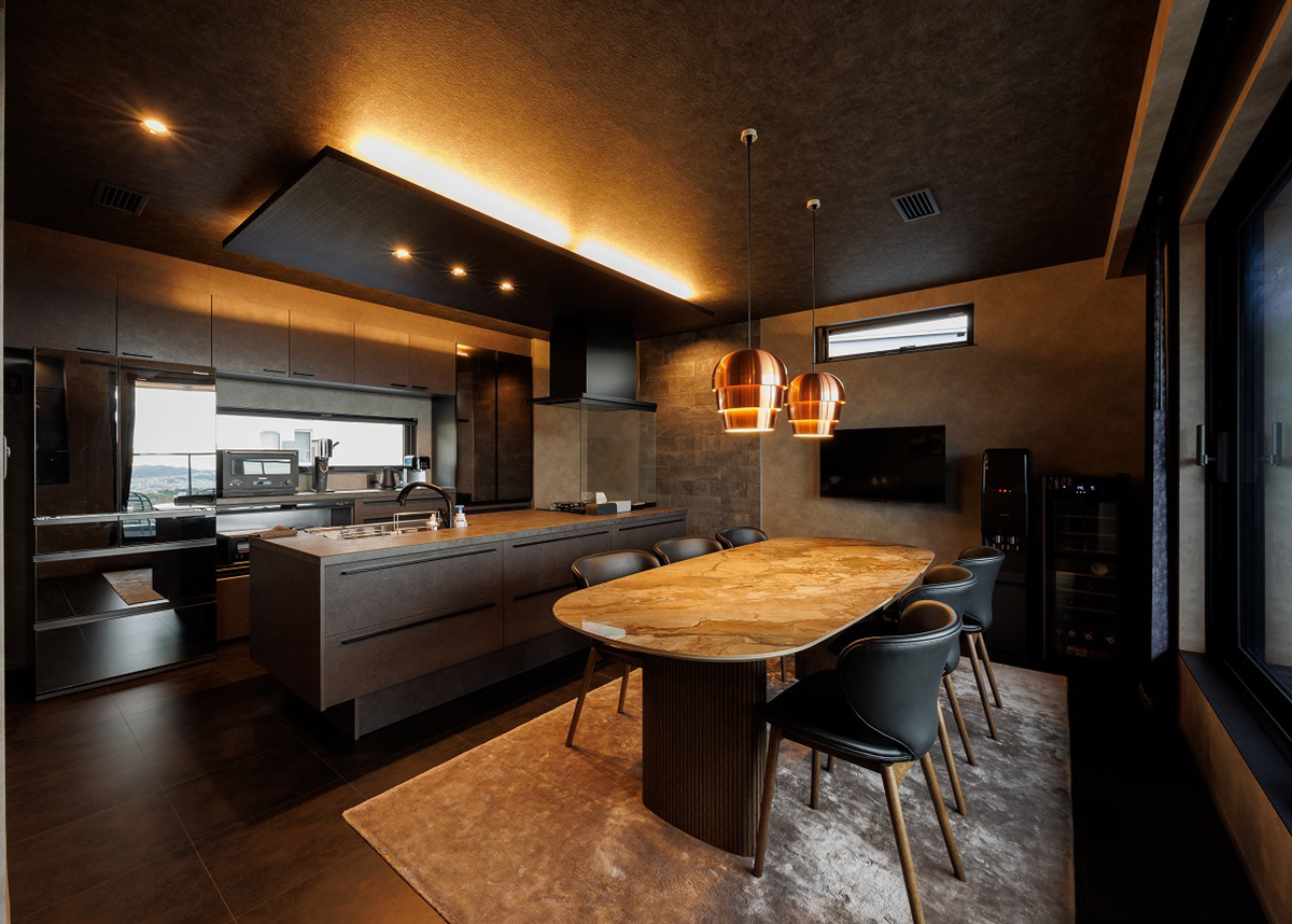 2階には約40帖の大空間LDKがあります。キッチン上の下げ天井の間接照明と大きなペンダントライト二つからの上品な光で更に高級感ある空間に仕上がっています。