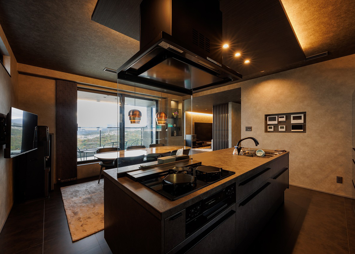 LIXIL様の上質なグレーのキッチンが備わっています。そのキッチンやダイニングからは約7帖の屋根付きバルコニーが見え、透明なパネルの先に広がる景色を楽しむことができます。